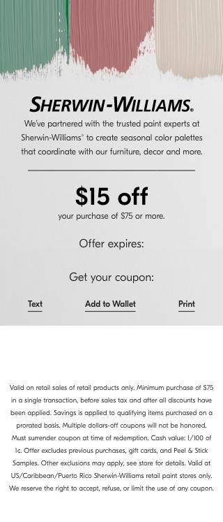 How to Always Find a Sherwin-Williams Coupon Once you give your consent to receive text messages, you'll get a coupon good for $10 off a $50 purchase. 3. Don't be afraid to ask their employees for a coupon or discount, even if you don't have one. The employees at Sherwin-Williams are always so helpful. (I'm talking Ace Hardware level of helpfulness!)