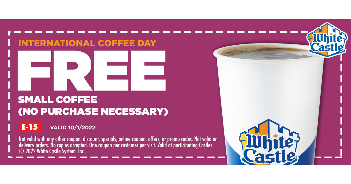 White Castle Coupon Promotion: One Free Slider & Freestyle Drink (Today ... White Castle Coupon Promotion. Get Coupon at White Castle! Promotion: One Free Slider & Freestyle Drink Expiration: Only on May 15, 2019 Availability: Participating locations Terms & Conditions: Not valid with any other coupons, discounts, specials, online coupons, or offers.No copies accepted. One coupon per customer per visit.